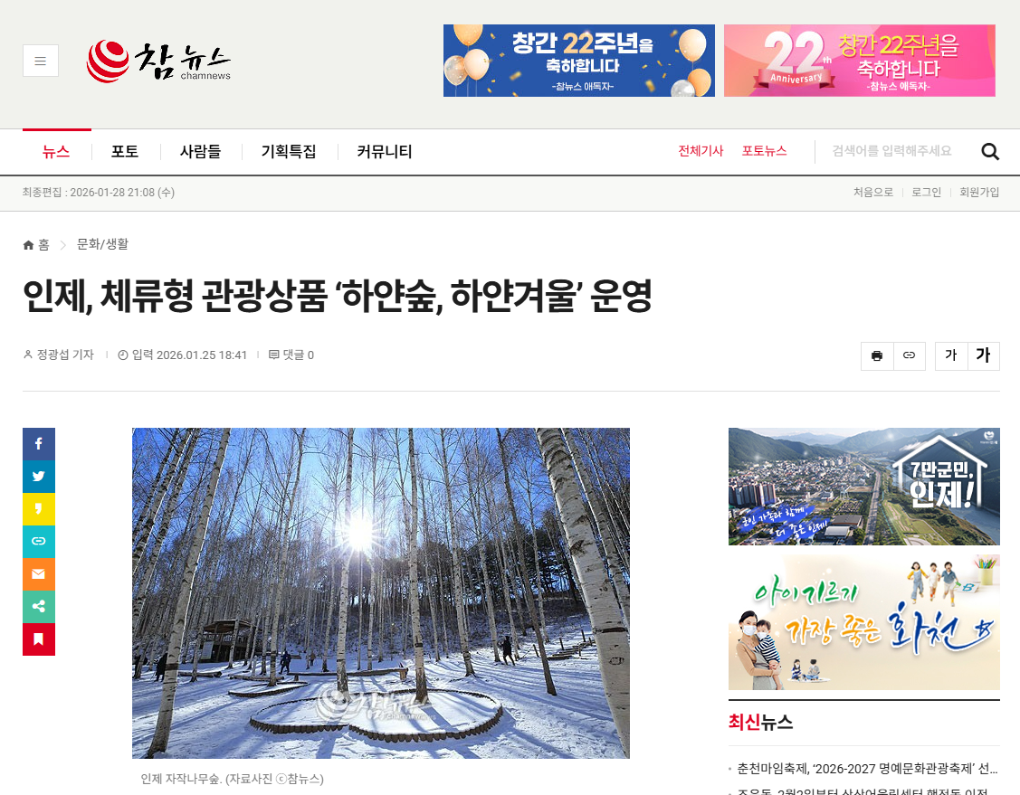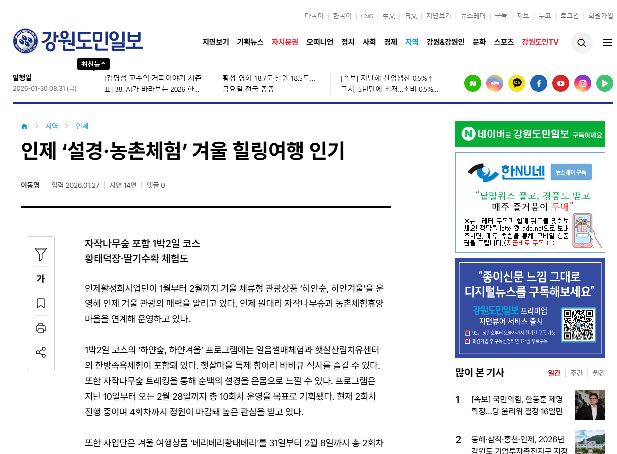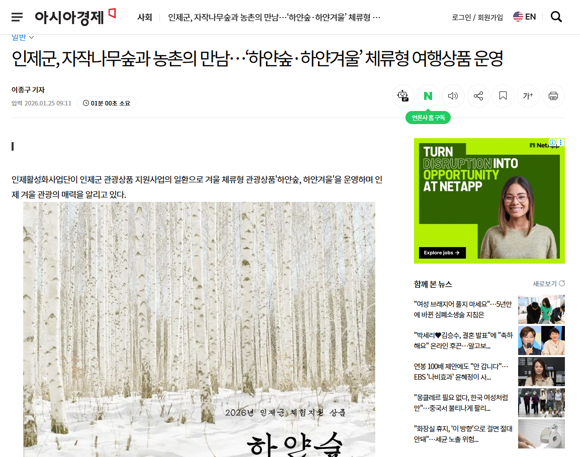 ▲ [출처_아시아경제 이종구 기자] 인제활성화사업단이 인제군 관광상품 지원사업의 일환으로 겨울 체류형 관광상품'하얀숲, 하얀겨울'을 운영하며 인제 겨울 관광의 매력을 알리고 있다. | 출처 : 아시아경제 | https://www.asiae.co.kr/article/2026012509114257809