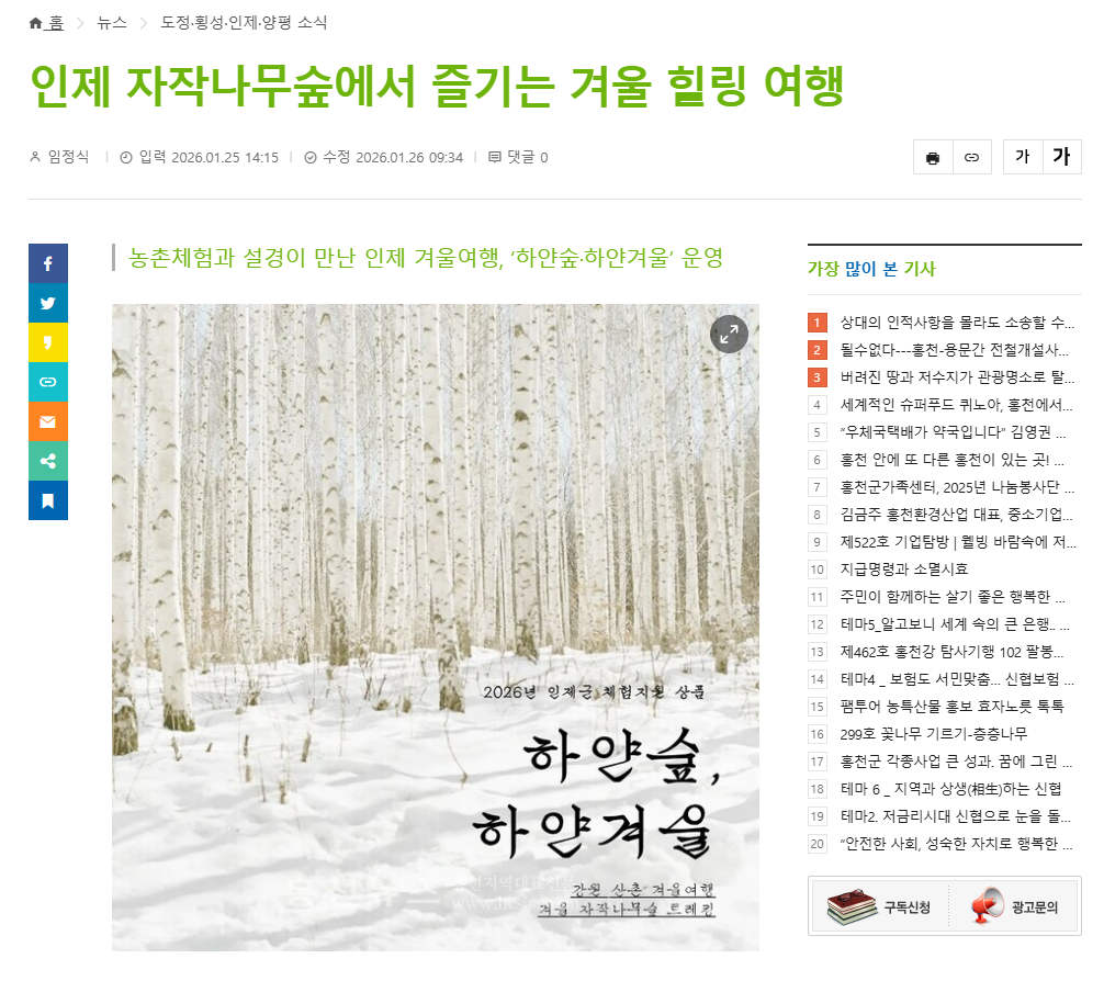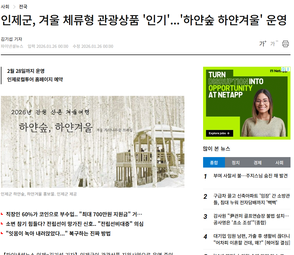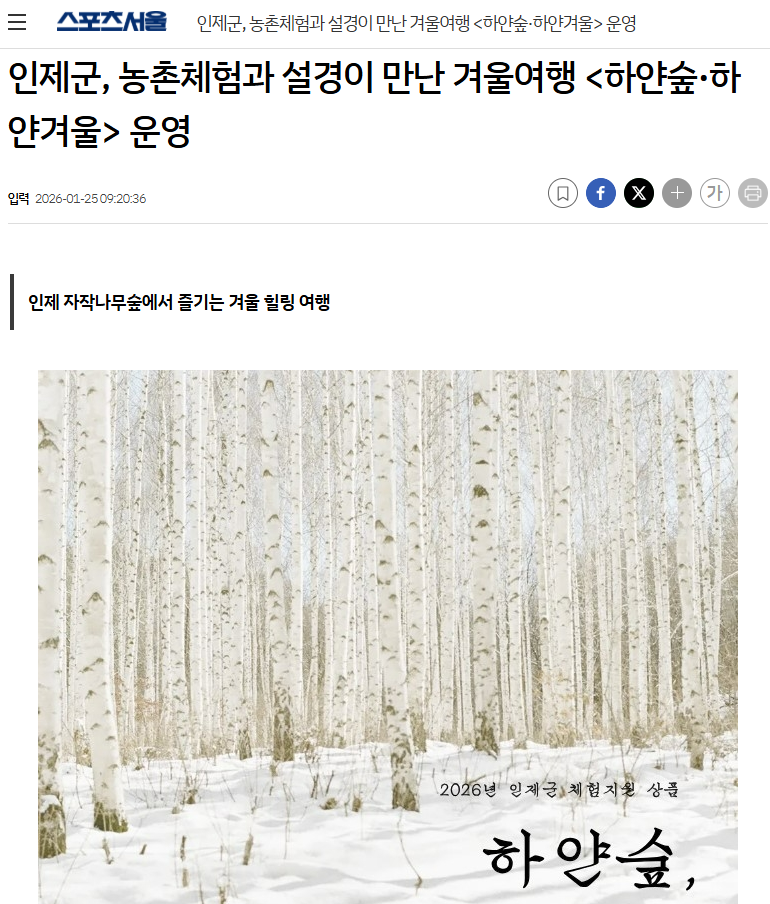 ▲ [출처_아시아경제 이종구 기자] 인제활성화사업단이 인제군 관광상품 지원사업의 일환으로 겨울 체류형 관광상품'하얀숲, 하얀겨울'을 운영하며 인제 겨울 관광의 매력을 알리고 있다. | 출처 : 아시아경제 | https://www.asiae.co.kr/article/2026012509114257809